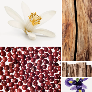 Неролі | Рожевий перець | Сандалове дерево | Кедр | Ірис (квітка) | Жасмин | Пачулі | Петітгрейн | Розмарин | Ветивер | Іланг-іланг